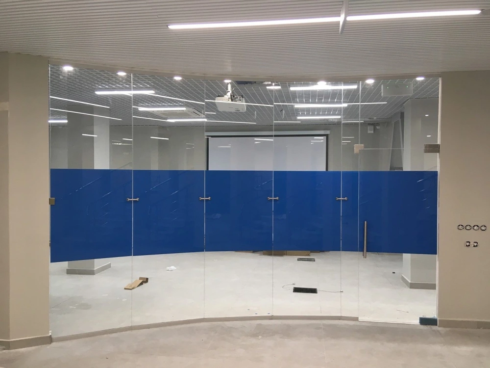 - Бескаркасного исполнения, сделанные из закаленного стекла, которые монтируются к полу и потолку в 2 точках опоры. Имеют звукоизоляцию 36 децибел - вы сможете спокойно поговорить в переговорной и не опасаться того, что разговор станет достоянием посторонних лиц